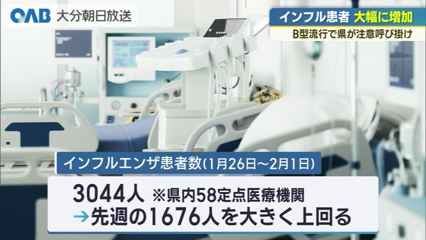 県内のインフルエンザ患者数が、先週から大幅に増加しました。 ■県感染症対策課 池辺淑子課長: 「今週、先週に比べて1.8倍くらい。急に増えてきて、いつもと違う急上昇」 先月26日から今月1日までの1週間に、県内58の医療機関で確認されたインフルエンザの患者数は、3044人でした。 先週の1676人を大きく上回っています。 ■県感染症対策課 池辺淑子課長: 「A型にB型が置き換わってきている。B型が、感染者が増えている主な要因。1回かかったから大丈夫ということではないことに注意を」 また、県の教育委員会によりますと、4日、県内の公立学校では、大分市や別府市などで69の小中学校が学年・学級閉鎖となり、九重町の東飯田小学校では学校閉鎖の措置が取られています。
