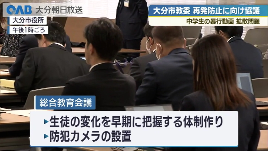 中学生の暴行の様子を撮影した動画がSNSで拡散された問題を受け、大分市教育委員会が再発防止に向けた対応などについて協議しました。 ■中野記者: 「会議はこのあと非公開で行われます。大分市内の中学校で明らかになったいじめ問題についても話し合われる予定です」 この問題は、大分市内の中学校で2025年、生徒が別の生徒を殴ったり蹴ったりする動画が撮影されSNS上で拡散されたものです。 動画に映っていた暴力行為について市教委は「いじめ重大事態に当たる」と認定しています。 25日に大分市役所で開かれた総合教育会議には足立市長ら6人が出席し、生徒の変化を早期に把握できる体制作りや防犯カメラの設置について話し合ったということです。 ■大分市教育委員会 粟井明彦教育長: 「トラブルが起きたら先生がすぐに把握できる体制を整えていくことが大切だと意見をいただいた。それに向かって何ができるかを考えていく」 市教委は、今後第三者委員会を設置し事実究明や再発防止に向けて調査を実施する予定です。