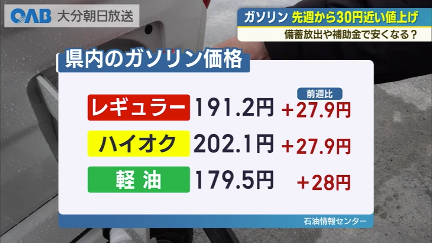 先週に比べ30円近い値上がりです。 18日に発表された県内のガソリン価格は、混迷する中東情勢を受けすべて大幅に値上がりしました。 石油情報センターが発表した今週月曜時点の県内のガソリン平均価格は、レギュラーが191・2円、ハイオクが202・1円、軽油が179・5円でした。 先週からの上がり幅を見るといずれも28円程度の値上げです。 中東情勢の悪化でホルムズ海峡が事実上封鎖され、原油価格が高騰した影響とみられています。 日田市にあるこちらのスタンドでも、利用客から悲痛な声が聞かれました。 ■給油客: 「車が必要な地域ガソリンが上がっちゃうとけっこうしんどい。かといって公共交通機関が充実しているわけでもない」 ■給油客: 「会社的には大変(業務用の車が)。1日500キロメートルくらい(走る)。みんなで合わせると走るので相当な(負担に)なる」 ■日田九石販売 高倉公博さん: 「数量指定や金額指定が増えた。(高値は)おそらく続くのではないか。中東情勢が落ち着く以外解決策はないと思う」 ガソリン価格の急騰を受けて、政府は備蓄石油の放出や補助金などの対策を打ち出しています。 果たして、ガソリン価格は安くなるのでしょうか? 中東情勢の緊迫化を受け、先週からガソリン価格が大幅に値上がりしました。 こちらは県内のレギュラーガソリン価格の推移です。 高止まりしていた価格は、暫定税率廃止に向けた政府の補助金で、2025年11月から次第に下がっていきました。 先週は中東情勢の影響はまだ小さく163・3円でしたが、今週は一気に上がり191・2円に。 27・9円の値上がりです。 これは過去最高値となった2023年9月の192・1円に迫る価格です。 政府は今回の高騰に対して2つの対策を打ち出しています。 1つが備蓄石油の放出です。 民間に義務付けている備蓄量を引き下げることで供給量を増やそうというものですが、石油関係者に取材すると「小売価格にはすぐに影響は出ないのではないか」、「備蓄放出について情報が入ってこないからわからない」と私たちが受けられる恩恵は不透明です。 もう一つが補助金です。 政府は、19日から石油元売り会社にレギュラー170円程度になるよう補助金を出すとしています。 ではいつから店頭価格は安くなるんでしょうか。 野村総合研究所のエグゼクティブ・エコノミスト木内さんは、「石油元売り会社は水曜日に卸価格を決める。 18日に補助金を反映せず価格を決めればスタンド価格は26日から大幅に下がることになる」としています。 ただスタンドによっては高い価格で仕入れた在庫が残っている場合も考えられ、価格反映にはまだ時間がかかるところもありそうです。