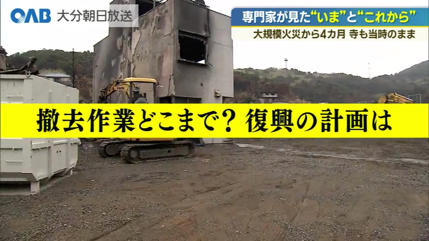 大分市佐賀関で起きた大規模火災から4カ月。がれきの撤去作業が進んでいます。専門家と一緒に現地に入りました。 高台にあるお寺は、被害を受けたままの姿でした。 ■佐藤伊音アナウンサー: 「鎮火まで2週間以上を要した佐賀関の大規模火災。発生から4か月のきょう、現場ではしとしとと雨が降り続いています」 1人が亡くなった佐賀関の火災では、強風による飛び火などで被害が拡大。 地域住民の拠り所のひとつで高台にある寺、東林庵も被害に遭いました。 4カ月が経った18日、市の立ち合いのもと寺の敷地に入ることができました。 ■佐藤伊音アナウンサー: 「ここが東林庵があった場所ですか、うわ…ちょっと。跡形もないお寺の姿もなにもない状態になっている」 敷地には、大量の瓦や鐘、賽銭箱などが焦げた状態で残っていました。 防災に詳しい大分大学理工学部小林祐司教授は。 ■大分大学理工学部 小林祐司教授: 「飛び火した強風だったのがここに立つとよくわかる」 火災の焼損面積は約6.4ヘクタールに上っていて、市は1月中旬からがれきの撤去作業を進めています。 作業開始から2カ月。いまの進み具合は-。 ■佐藤アナウンサー: 「まさに撤去が進んでいますが、ここはかなり更地になりましたね」 ■大分大学理工学部 小林祐司教授: 「ここを軸に復興・復旧を進めるのかなと見て取れますね」 こちらは火災発生から9日後に撮影された漁具メーカー・八潮工業周辺。 焼け焦げたものがたくさんありましたが…きょう見ると、撤去されていました。 高台からも八潮工業があった場所の周辺の建物がなくなっていることがわかります。 一方で被災エリアのほとんどがまだ手をつけらていない状態です。 作業を困難にしているのにはいくつかの理由があります。 まずは道路の狭さ。 多くのがれきを運ぶために必要な10トントラックが入ることができず、いまは4トントラックで何度も往復しています。 そして古い建物が多いため、吸い込むと体に有害なアスベストが出る可能性があること。 重機で一気に壊すことができず手作業で取り除いていたということです。 ■大分市防災危機管理課 尾島千咲課長: 「順調に進んでいる。復興市営住宅の建設に向けて仮設道路の建設ができる状況に向かっている」 大規模火災から4カ月。ようやく変化が見えてきましたが撤去作業の終わりはいつなのか。 そして市が予定している復興計画は。 あの大規模火災から4カ月が経ちましたが、公費でのがれきの撤去作業は続いています。 作業は1月15日にスタートし2026年の11月までに終了する予定ですが、172棟のうち、いま作業が進んでいるのは29棟なんです。 このペースで予定通りに終わるのでしょうか。大分市に今後の動きを聞きました。 いま作業中の29棟は、黄色の線で示したこの地域では一番大きな市道・田中線沿いの赤色のエリアの建物が中心です。 ここでの作業は3月中に終わる予定です。 そうすると道幅が広くなるので10トントラックや重機が通れて作業が可能になりますので、4月以降は作業効率が倍ほどになり、道路沿い以外の地域での作業も進められます。 こういった理由で市は「作業は順調」としています。 一方建物の解体以外にも市は3つの復興計画を示しています。 1つ目「生活自立再建の推進」。支援や住まいの確保など。 2つ目が「災害に強いまち」。火災対策やインフラの強化。 3つめが「住み続けられるまち」。コミュニティや住民福祉を考えることです。 市は4月以降、被災住民との会を開き意見交換をしながら方針を決めることにしています。 18日も現地を見た大分大学の小林教授は「地域の背景や住民の思いを明らかにしないと具体的なまちづくりは進みにくい。地域から人が離れないためにも早急な住民の意思確認が復興のカギになる」と指摘しています。 安心できるまちが少しでも早く戻るために住民と自治体の意思の疎通が重要となりそうです。