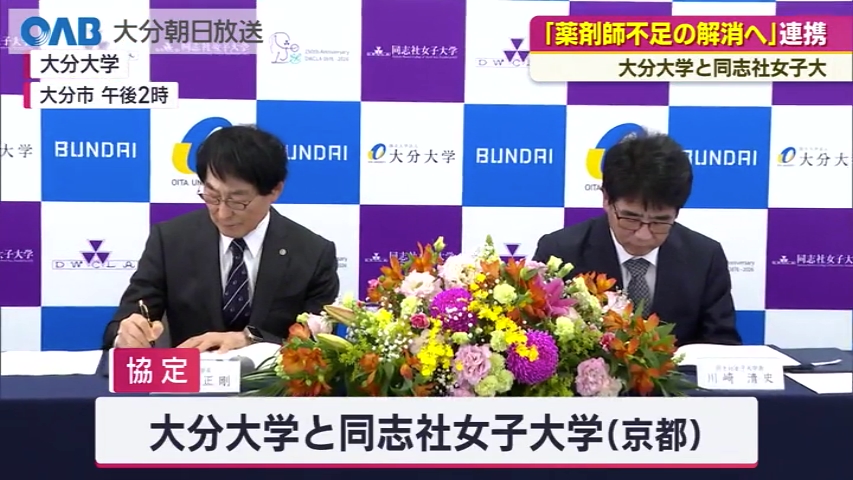 県内で課題となっている薬剤師不足の解消に向けて、大学同士の連携が始まりました。 協定を結んだのは、大分大学と京都の同志社女子大学です。 県内には薬学部がなく、薬剤師の確保が大きな課題となっています。 今回の協定では、同志社女子大学の薬学生を大分大学医学部附属病院の実習生として受け入れるほか、これまで医学部では行えなかった医薬品に関する研究も可能になります。 ■大分大学 北野正剛学長: 「同志社女子大学との提携によって、学生の交流、さらには研究者の交流が活発になる。県内に不足している薬剤師の問題が、少しでも好転するようにと願っています」 大分大学側は、将来的なUターン就職にもつなげたい考えです。