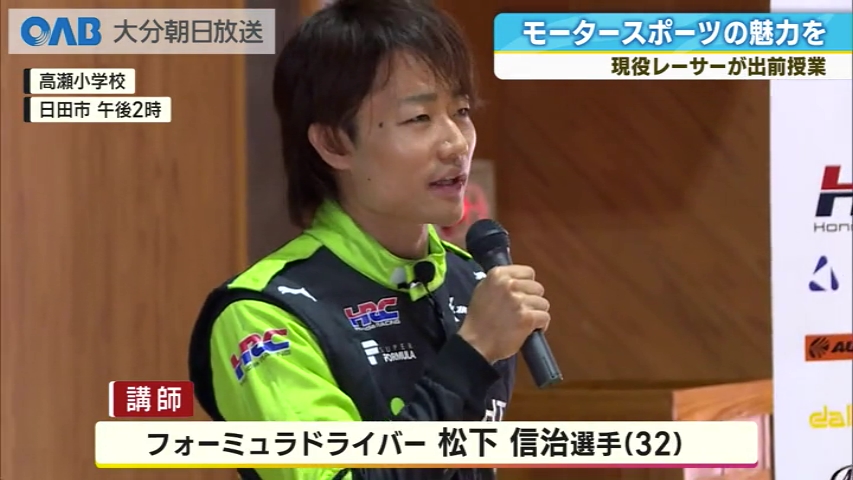 日田市の小学校で、モータースポーツの魅力を伝える出前授業が開かれました。 日田市立高瀬小学校で、初めて開かれました。 講師には、スーパーフォーミュラで活躍する松下信治選手が招かれました。 松下選手は、フォーミュラマシンの仕組みを解説したほか、自身の経験や挑戦についても語りました。 授業は1時間にわたって行われ、4年生から6年生までの約95人が参加しました。 児童 「車に乗ってハンドル持った時に、ハンドルがでかくて前が見えなかった」 「たくさん車のことを学べてよかったです。 運転したいと思いました」 主催者は今後もこうした活動を通じて地域に貢献するとともに、子どもたちに夢を持ってもらいたいとしています。