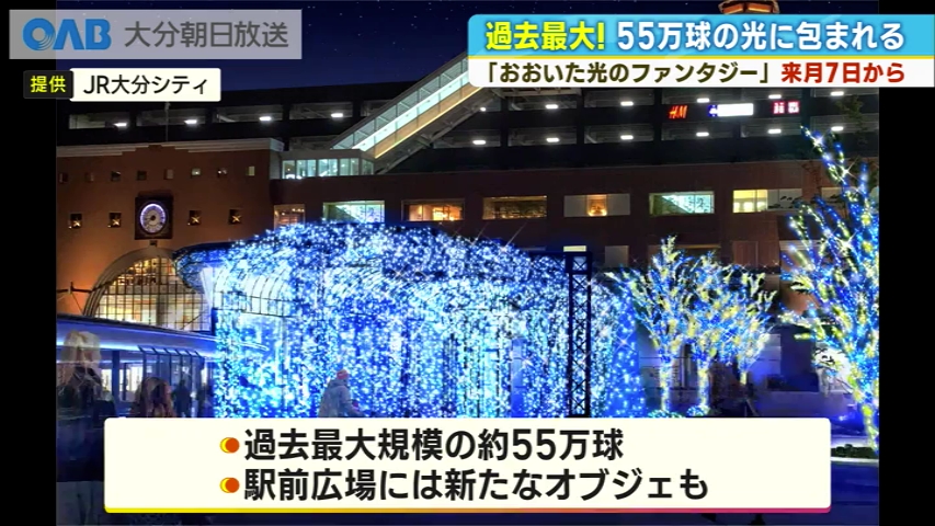 今年も大分市の街中を美しく彩ります。 JR大分駅周辺をイルミネーションで彩る冬の恒例イベント「おおいた光のファンタジー」。 主催する大分都心まちづくり委員会とJR大分シティが今年の概要を発表しました。 今年は過去最大規模となるおよそ55万球のイルミネーションが飾られるほか、駅前広場には新たなオブジェも登場します。 「おおいた光のファンタジー」は、来月7日から来年2月14日まで開催され、初日には点灯式が行われます。