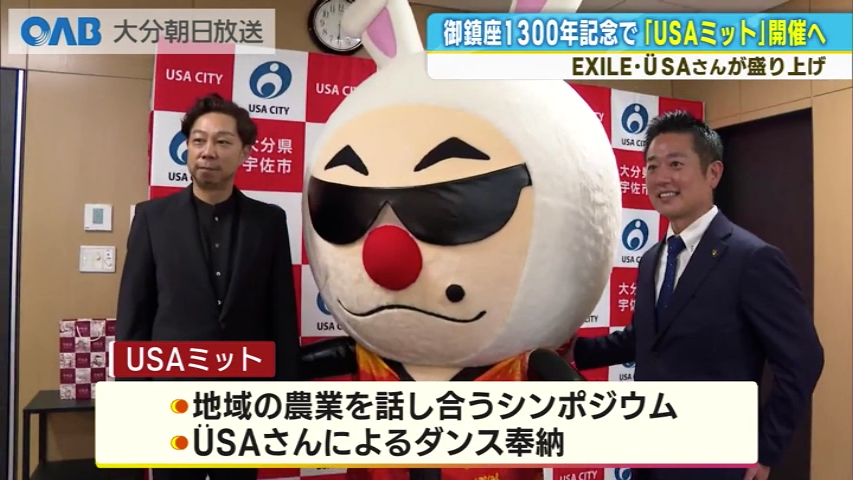 宇佐市にUSAさんがやってきました。 宇佐市役所を訪れたのは、エグザイルのUSAさんです。 宇佐神宮の御鎮座1300年を記念して開かれる「USAミットごちふるマルシェ」について後藤竜也市長に報告しました。 「USAミット」では、地域の農業の現状や課題を話し合うシンポジウムのほか、USAさんによるダンスの奉納も予定されています。 ■EXILE USAさん: 「全国各地の美味しいものや特産品が集まって、音楽と踊りが融合した楽しいイベントになっています。ぜひ遊びに来てください」 イベントは来月22日から3日間、宇佐神宮と宇佐神宮球場で開かれます。