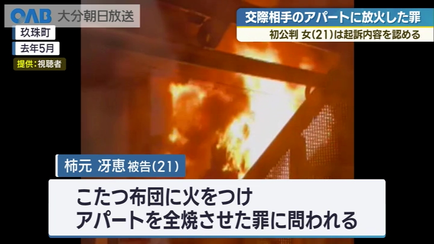 交際相手が住むアパートを全焼させたとして、放火の罪に問われている女の初公判が開かれ、女は起訴内容を認めました。 起訴状によりますと、柿元冴恵被告(21)は2025年5月、玖珠町のアパートでこたつ布団にライターで火をつけ、2階建てのアパートを全焼させた罪に問われています。 2月3日の初公判で、柿元被告は起訴内容を認めました。 検察側は、「同級生の父親と6年ほど前から不倫関係にあり、他に交際相手がいると疑いけんかになったことから犯行に及んだ」と指摘しました。 一方、弁護側は「自閉スペクトラム症と診断されていて、精神的に追い詰められ突発的に行動してしまった」と述べました。 判決は12日に言い渡されます。