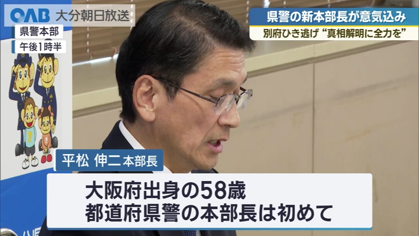 1月23日に着任した大分県警の新しい本部長が意気込みを語りました。 平松伸二・本部長は、警察庁の交通局など交通部門の経験が豊富な大阪府出身の58歳。 都道府県警の本部長を務めるのは、初めてです。 ■平松伸二本部長: 「両親の新婚旅行先は大分だった。落ち着いたら食も温泉も、大分の魅力を存分に味わいたい」 4年前に別府市で起きた死亡ひき逃げ事件については、「県警の最重要課題として1日も早い真相解明に全力を尽くす」と話しました。 県警によりますと、この事件に関する情報提供はこれまでに1万2000件あまりで、この1カ月で285件の情報が寄せられています。