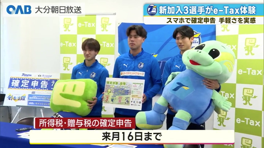 シーズン開幕を迎えた大分トリニータ。新加入の選手たちが、ピッチの外での準備に臨みました。 今シーズン加入した桜井勇斗選手、坂田陸選手、吉川敬進選手の3人が、スマートフォンを使った確定申告を体験しました。 税務署の職員から、オンライン申告「e-Tax」の操作方法を教わりました。 マイナンバーカードと連携すると、医療費やふるさと納税などのデータが自動で入力され、ミスを防ぎながらスムーズに申告することができます。 ■桜井勇斗選手: 「スマホひとつで(申告が)できるのですごい便利だと思いました」 ■坂田陸選手: 「思っていたより簡単にできたので、みなさんもよければやってみてください」 e-Taxの利用者は年々増えていて、確定申告をする人の約7割が利用しています。 所得税と贈与税の申告期限は、3月16日までです。