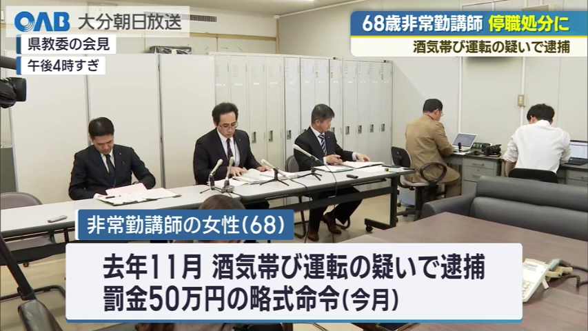 2025年11月、酒気帯び運転の疑いで逮捕されていた非常勤講師の女性が停職処分を受けました。 県立学校に勤務していた68歳の非常勤講師の女性は、2025年11月、国東市内で車を運転。 警察官からアルコール検知を受けたところ、吐いた息1リットルあたり0.71ミリグラムのアルコールが検出されたとして逮捕され、罰金50万円の略式命令を受けていました。 県教委は、この女性講師を26日付けで停職1か月の処分にしました。 本来は停職6カ月相当ですが、今年度で契約が終わり来年度は結ばないということです。 県教委は「不祥事の根絶に向けて改めて教職員に指導する」としています。