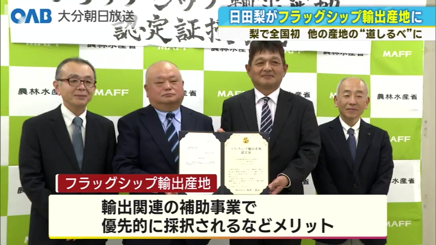 「梨」での認定は、全国で初めてです。 JAおおいた日田梨部会が、農林水産省の「フラッグシップ輸出産地」に選ばれ、認定証が授与されました。 この制度は、輸出の手本となる産地を国が認定するものです。 梨としては全国初の認定で、県内ではブリ、牛肉に続いて3例目です。 日田梨部会は2004年から輸出を本格化し、現在は台湾や香港、ベトナムなどに販路を広げています。 2024年度の輸出量はおよそ130トン、金額は約6900万円です。 ■JAおおいた日田梨部会 堀真剛部会長: 「他の産地の道しるべになって、政府が進めている2030年、5兆円の農産物輸出額の一端でも担えるよう、頑張っていきたい」 今回の認定により、輸出関連の補助事業で優先的に採択されるなど、さらなる輸出の拡大が期待されています。