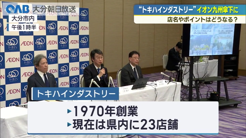 56年にわたって親しまれているスーパーのトキハインダストリーが、10日正式にイオン九州の傘下に入りました。 名前や店はどうなるのか。会見が開かれました。 ■トキハインダストリー 川村泰平社長: 「大分県で圧倒的に信頼されて愛され、シェアが一番になることを目指していく。魅力ある特徴をイオン九州パワーで磨き上げていく」 10日に就任したトキハインダストリーの川村泰平社長が、午後会見を開き、これからの目標を明らかにしました。 大分県内に23店舗を構えるトキハインダストリーは1970年の設立以来56年にわたって親しまれてきました。 川村社長は、「これまでトキハインダストリーが培ってきた伝統はそのままに、イオン九州が持つ物流の安定供給や品ぞろえを生かしていく」と意気込みを表わしました。 今回イオン九州の傘下に入ったことで、お店の名前や店舗はどうなるのか、日頃利用している人は特に気になると思います。 大きく変わるのは、イオンのプライベートブランド「トップバリュ」などが店頭に並びます。 コスパが良い人気の商品が、早ければ6月~7月くらいにはトキハインダストリーの全店舗に並ぶ予定ということです。 また、イオンのポイントサービスが使えるようになる可能性もあります。 電子マネーWAONのトキハインダストリーでの利用について、客の声を聞きながら検討するということです。 一方でこれまでと変わらないこともあります。 既存のイオン店との合併はなく、トキハインダストリー23店舗はこれまで通り営業。 来年度までに順次リニューアルを進めていきたいと話します。 そして、トキハインダストリーという名前も変更せず双葉会やトキポのポイントも引き続き使えるということです。