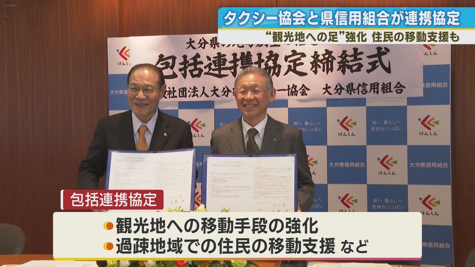 県タクシー協会と県信用組合が、包括連携協定を結びました。 インバウンドを中心に観光客が増える中、課題となっている観光地での「二次交通」の充実につなげるのが狙いです。 観光地への移動手段の強化に加え、過疎地域や交通空白地帯での住民の移動支援にも取り組みます。 ■県信用組合 吉野一彦理事長: 「公共交通であるタクシーの力を借りて、大分県の交流人口を増やし、もっともっと魅力ある大分県に。ともに手を携えて進みたい」 さらに、地域をまたいだ配車サービスの充実や、高校での企業説明会の開催などを通じて、運送業の担い手確保や若者の県内就職の促進も目指します。