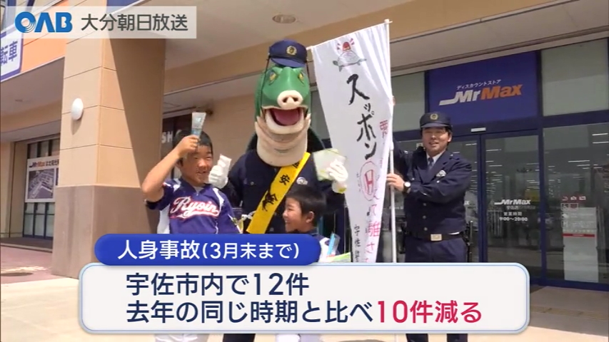 安心院の特産「スッポン」が交通事故の防止を呼びかけました。 「プレゼントだポン! 交通安全気をつけてポン!」 宇佐警察署のオリジナルキャラクターとして誕生したスッポンポリス。「悪を捕らえて離さない」そんな気持ちが込められています。 12日は大分県宇佐市内のディスカウントストアで、自転車の青切符制度の違反行為が書かれたチラシなどを配りました。 【宇佐警察署 地域交通課 宮部哲史課長】 「事件・事故を1件でも減らすため、街頭に立ったり各種イベントで広報して、積極的に活用していきたい。」 警察によりますと、3月末までに宇佐市内で発生した人身事故は12件で、前年の同じ時期と比べて10件減っています。