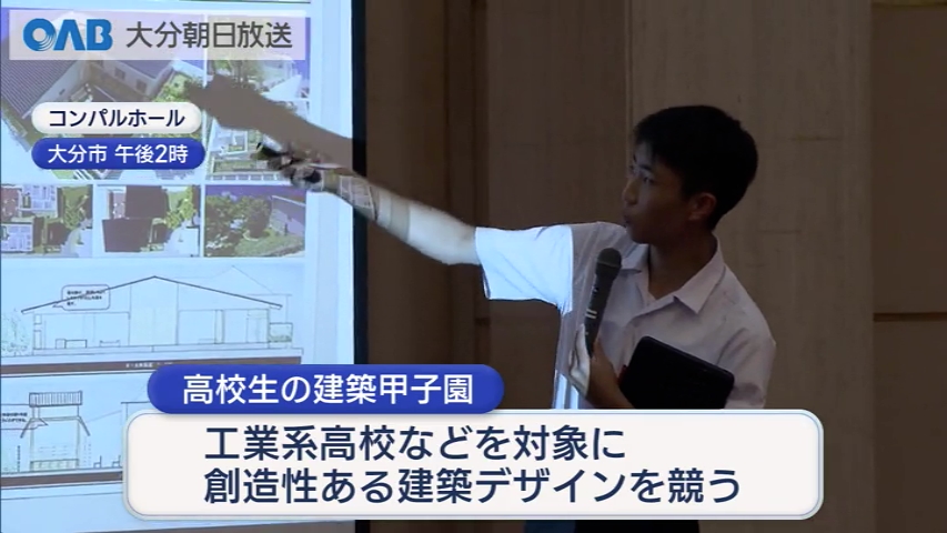 アイデアあふれる戸建て住宅を提案する建築甲子園の大分大会が開かれました。 建築甲子園は工業系高校などに通う生徒が創造性ある建築デザインを競うものです。 今年のテーマは「地域に根ざした新しい和室がある戸建て住宅」です。 大分県大会には、工業系高校から合わせて3チームがエントリーし、外の空間とのつながりや交流を意識した自由なアイデアが発表されました。 優勝者は全国の一次審査会に進みます。