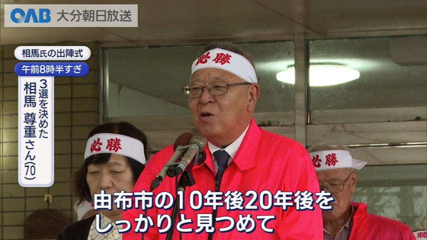 任期満了に伴う由布市長選挙は、現職の相馬尊重さんが無投票で3選を決めました。 (3選を決めた相馬尊重さん) 「由布市の10年後20年後をしっかりと見つめて更に由布市が発展するよう努めてまいりたい」 無投票で3選を決めた相馬尊重さんは70歳。 現在の由布市挾間町出身で、市の総務部長や副市長を歴任し2017年から市長を2期務めてきました。 老朽化した社会インフラの整備や公共交通機関の充実などを公約に掲げ立候補しました。 任期は10月30日から4年間です。