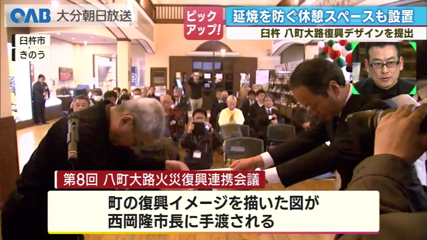 去年臼杵市で起きた火災、復興が進んでいます。 復旧・復興について話し合う会議が開かれ、復興後の町のイメージ図が市長に提出されました。 去年11月、臼杵市中心部の商店街「八町大路」で火災が発生し、住宅や店舗あわせて15棟が焼けました。 18日、8回目の復興連携会議が開かれ、町の復興イメージを描いた図が西岡隆市長に手渡されました。 商業施設と住居が共存したエリアだけでなく、休憩所などを設置しスペースを作ることで、万一火災が起きた際に延焼の拡大を防ぐ狙いが報告されました。 ■八町大路火災復興連携会議 藤原紳一郎会長: 「臼杵は町並みを残そうという商店街ですので、賑わいを取り戻そうそういった思いは皆さん一緒でした。そういうイメージ図ができた」 歴史的な町並みを残し復興へ。火災を教訓にした新たな八町大路のイメージとは? 発災から1年が経ち、ようやく町の復興イメージが見えてきました。 今回の復興連携会議で示されたイメージ図です。 更地になったこのエリアに、緑で示されている商業施設と住居区域が共存したゾーンと火災時に延焼が広がらないよう空間を作るということです。 ただ、こちらは歴史的な町並みが残る景観形成重点地区でもあり、伝統的な町並みの保全が必須となっています。 建物を建てる際には守るべき基準があり、例えば建て方を揃える壁面、高さ、軒などです。 他にも外構にも配慮し、木の柵などの設置が必要です。 今回イメージ図で明らかになったそれぞれのエリアの特徴を見ていきます。 まず商住共存ゾーン。ここは住宅、そして店舗が共存した賑わいのある商業空間を想定しています。 復興アイデアでは、1階に店舗飲食店や銭湯などを作り2階に住居を構える案や、まちの駅をつくる案などが出されています。 来年9月までに実現案を固めたいとしています。 そしてもう1つ今回の町づくりのポイントとなっているのが「防災空間ゾーン」です。 町並みに調和した防災空間が作られます。 具体的には休憩所やベンチ、日陰など小さな公園のようなイメージです。 他にも防火水槽や復興モニュメントの案もあり2028年3月までに供用開始していきたいということです。 今後はエリアごとに復興方針が決まっていくということです。