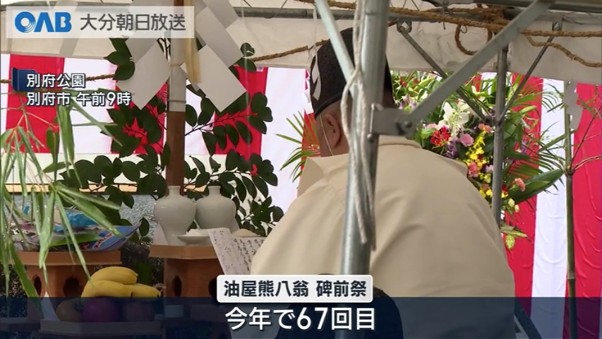 別府観光の父 油屋熊八しのび神事 大分県・別府観光の父・油屋熊八をしのぶ催しがありました。 別府公園にある記念碑の前で毎年開かれていて、2025年で67回目です。 別府観光の父として知られる油屋熊八の偉業をたたえ別府市の発展につなげていくため、市や観光協会、ホテル旅館組合などからなる油屋熊八翁顕彰会が開催しています。 長野恭紘 別府市長 「しっかりと遺志を受け継ぎ素晴らしい街いつの時代も人々の心を魅了しわくわくドキドキする街をつくっていきたい」 市の関係者のほか熊八の出身地、愛媛県宇和島市の観光物産協会の関係者ら約50人が参加し玉串を奉納するなど熊八をしのびました。