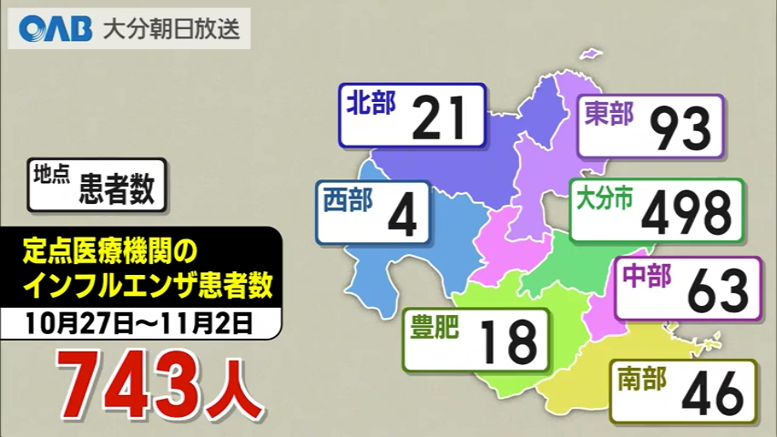 県内でインフルエンザの患者が急増しています。 県は流行の拡大に注意を呼びかける「注意報」を発表しました。 県によりますと、先月27日からの1週間に、県内58の定点医療機関から報告された患者数は743人で、前の週と比べて111%の増加、倍以上の数となりました。 1医療機関あたりの患者数も県全体で12.81人と、前の週に比べると倍以上に増え、4週連続の増加となっています。 特に大分市では、定点当たり29・29人と、警報の開始基準値である30人に迫っています。 5日、県内の公立学校では、大分市、臼杵市、国東市の小・中・高校で、4つの学年閉鎖。 5つの学校であわせて11クラスが学級閉鎖となっています。
