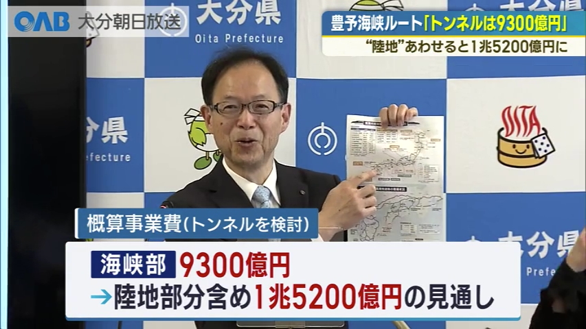 大分と愛媛を結ぶ豊予海峡ルートのうち、海底トンネルの整備事業費は概算で9300億円に上るという試算が23日公表されました。 豊予海峡ルートは、大分市の佐賀関と愛媛県の佐田岬をトンネルや橋で結ぼうという計画で、両県の交流による経済の発展や、関門海峡での災害時など第二国土軸への期待が持たれています。 佐藤知事は23日、トンネルを整備した場合、海峡部で9300億円、陸地部分も含めると1兆5200億円の費用がかかる見通しであることを明らかにしました。 試算は県の委託を受けた東京の建設コンサルタント会社が行い、水深など、条件が近い青函トンネルと同じ工法を想定しています。 長さ約14キロの海峡部には、車の通行用のほか排水や避難用など3本のトンネルを掘る構想です。 2022年に公表された大分市の試算では、別の工法で海峡部にトンネルを通すための事業費が4580億円でした。 およそ倍の事業費が見込まれていることについて佐藤知事は。 佐藤知事 「本坑(主なトンネル)だけ見ると6200億円と(大分市の試算が)4580億円なのであまり変わらないなと物価上昇分は当然あるのでその分は反映されていると思う。 ただ加えて、先進導坑と作業抗(車通行用以外のトンネル)はやはり必要だと思うので、それで3000億円ほど加えられている」 大分県は今後、橋を架けた場合の調査も進めるほか、民間が運営などに携わるPFI方式の導入の可能性についても検討します。