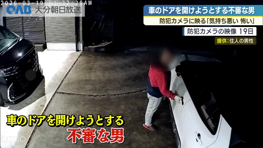 先週、大分市の住宅街で、車のドアを開けようとする不審な男の姿が防犯カメラに映りました。 警察に被害届を出した車の持ち主が当時の状況を語りました。 道から家の敷地に入る怪しい人物。 黒い車の助手席のドアを数回触ったあと隣の白い車のドアも開けようとしています。 手には軍手をはめています。 小栗アナ 「住宅街にあるこちらの防犯カメラに不審な男が映っていたということです」 防犯カメラで撮影されたのは先週木曜、3月19日の午前3時半ごろ、大分市ふじが丘の住宅街です。 この家の男性は、その日の朝不審な男が映っていることに気付いたそうです。 住人の男性 「びっくりしましたね、普通に入ってきて普通に触ってびっくりですね、センサーでライトが付くんですけどライトがついても動じず堂々とした様子気持ち悪いと怖いですね」 男性はその日のうちに被害届を提出。 警察も捜査していて「車の中には貴重品を置かず、必ず施錠するように」と呼び掛けています。