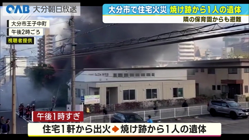 12日午後、大分市で住宅火災があり、1人の遺体が見つかりました。隣にある保育園の園児も避難しました。 午後1時すぎ大分市王子中町にある一軒家から火が出て、焼け跡から身元不明の1人の遺体が見つかりました。 (小栗アナ) 「消火活動が行われている建物の隣には保育園もあります」 出火当時、保育園には複数の子どもたちがいましたが、近くの豊和銀行本店に避難して全員無事でした。 (避難してきた園児) (Q火とか煙は見えた?) 「みえた」 (Qどんな様子だった?) 「煙が窓についた感じかな」 (迎えに来た保護者9 「Q聞いた時どうでした? もうパニックでした」 警察と消防は見つかった遺体の身元の特定を急ぐとともに、出火原因を調べています。