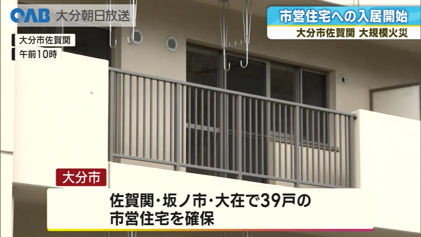 佐賀関で起きた大規模火災。被災した人の市営住宅への入居が始まりました。 大分市は、佐賀関、坂ノ市、大在であわせて39戸の市営住宅を確保しています。 (内野アナ) 「海沿いの避難所から歩いて5分ほどのこちらのマンションも市が用意した公営住宅です。エレベーター付きということもあり入居希望が集中したそうです。きのう業者が洗濯機や冷蔵庫を運び込む作業を進めました。 そしてきょう午前10時に鍵の引き渡しがありました。早速、避難者が住宅に入り込む姿が見られました」 大分市によりますと、50世帯の応募があり、高齢者や子育て世帯を優先して、27戸の入居が決まっています。 一方、佐賀関にある住宅を希望する人が集中したため、市は今回決まらなかった世帯を対象に2次募集を行います。 12月15日から申請を受け付け、19日には入居できる予定です。