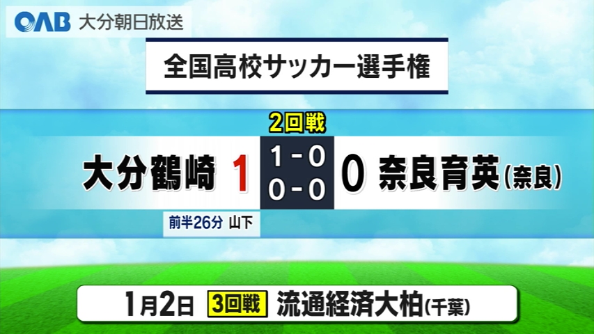 全国高校サッカー選手権の結果です。 大分代表の大分鶴崎は前半26分、左サイド木許のドリブル突破から、最後はフォワード山下の2試合連続ゴールで先制します。 後半はこの1点を守り切り、過去最高成績に並ぶベスト16に進出しました。 次の3回戦はあさって1月2日、千葉代表流通経済大柏と対戦します。