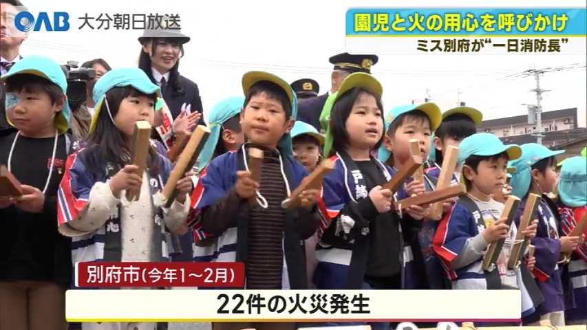 火災予防を呼びかけました。 ミス別府の鬼束芽生さんが別府市消防本部の一日消防長に委嘱され、こども園の園児たちと一緒に「火の用心」を呼びかけました。 そのあと、鬼束さんはマイクで市民に火災予防を呼びかけながらパトロールを行ったほか、はしご車の試乗も体験しました。 ■一日消防長 鬼束芽生さん: 「(一日消防長を)やりきれるかなという不安と、皆さんと一緒に火災の予防を気を引き締めていく思いで、務めさせていただきました」 別府市では、今年に入って先月までに22件の火災が発生しています。 消防は、春先は乾燥する日が多いため、火の取り扱いに十分注意するよう呼びかけています。