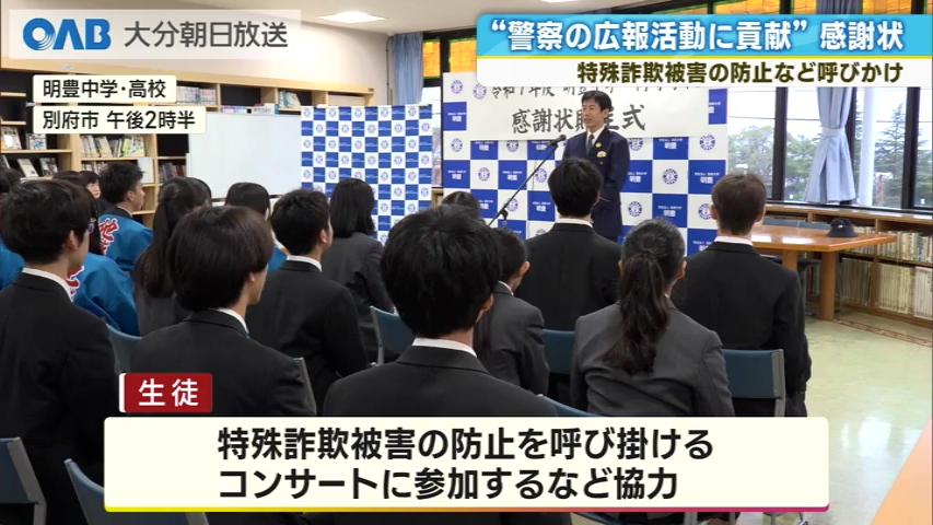 警察の広報活動に高校生たちが貢献です。 別府警察署の羽田優一署長から、明豊中学・高校に感謝状が贈られました。 生徒たちは今年度、商業施設で行われた特殊詐欺被害の防止を呼びかけるコンサートに参加したほか、交通安全のチラシ配りにも協力しました。 また、チアリーディング部が県警のインスタグラムの動画に出演し、ロマンス詐欺への注意を呼びかける活動も行いました。 ■明豊高校2年 後藤優希さん: 「自分たちの頑張ったことがこういう形で認めてもらえてうれしい」 別府警察署は「生徒たちの積極的な姿勢が、より良い啓発活動につながった」と話しています。
