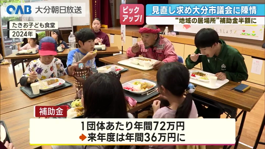 子ども食堂など、地域の居場所づくりを支援する大分市の補助金が、来年度から1団体あたり半額になる見込みです。 その見直しを求めて、運営団体などが大分市議会に陳情書を提出しました。 大分市は、2024年度から子ども食堂など地域の居場所づくりを支援する事業として、運営団体に補助金を交付しています。 これまでは12の団体に対し、1団体あたり年間72万円を交付していました。 しかし来年度の予算では見直しが行われ、1団体につき年間36万円と、半額になる方針です。 6日は、大分市で子ども食堂を運営する団体などが市議会を訪れ、補助金の減額を見直すよう求める陳情書を提出しました。 陳情書を手渡したのは、2022年から子ども食堂を運営している「たきお子ども食堂」の徳田英利代表で、ボランティアスタッフらとともに陳情しました。 ■たきお子ども食堂代表 徳田英利さん: 「1年間のスケジュールを全部決めて、予算を作ってやっている中で、唐突。無念さが1番」 子ども食堂など、地域の居場所づくりに対する大分市の補助金が半額になる見込みです。 その背景から見ていきます。 まず、県内の子ども食堂の数です。2020年度には76団体でしたが、去年12月末には172団体と、2倍以上に増えています。 そもそも大分市の「地域の居場所づくり推進事業」は、地域食堂と交流活動を行う団体の経費の一部を補助する取り組みです。 大分市の生活福祉課は、子ども食堂など地域の居場所の取り組みが年々増えているため、より多くの団体を支援できるよう補助制度を見直すと説明しています。 これまでは、年間72万円を12団体に交付していましたが、来年度からは1団体あたり36万円とする代わりに、およそ20団体に交付できるようにする方針です。 一方、子ども食堂の運営の現状はどうなのでしょうか。 大分市の「たきお子ども食堂」の場合、年に24回開催され、参加者はのべおよそ1500人です。 運営費の内訳は、食材費が年間35万から40万円。 開催場所として借りている公民館の使用料が年間6万から7万円ほどです。 このほか掲示物の作成やイベント、学習支援のテキスト代などもかかり、年間の支出はおよそ75万円になります。 その財源は、自治体や企業からの助成金・補助金のほか、寄付や食材提供、参加費などです。 たきお子ども食堂の場合、参加費は高校生以上で200円となっています。 補助金は運営にとって大きな支えとなっています。 徳田代表は、「物価高の中、続けていくためには開催回数を減らしたり、民間から寄付を募ったりしないと継続が厳しくなる」と話しています。 子ども食堂は、子どもだけでなく地域のつながりを生む場でもあります。補助金見直しを機に、今後の支え方が問われそうです。