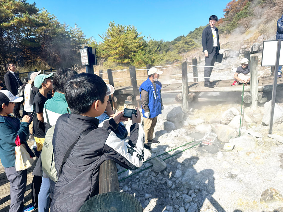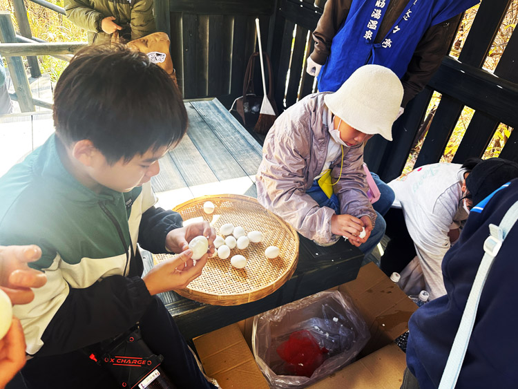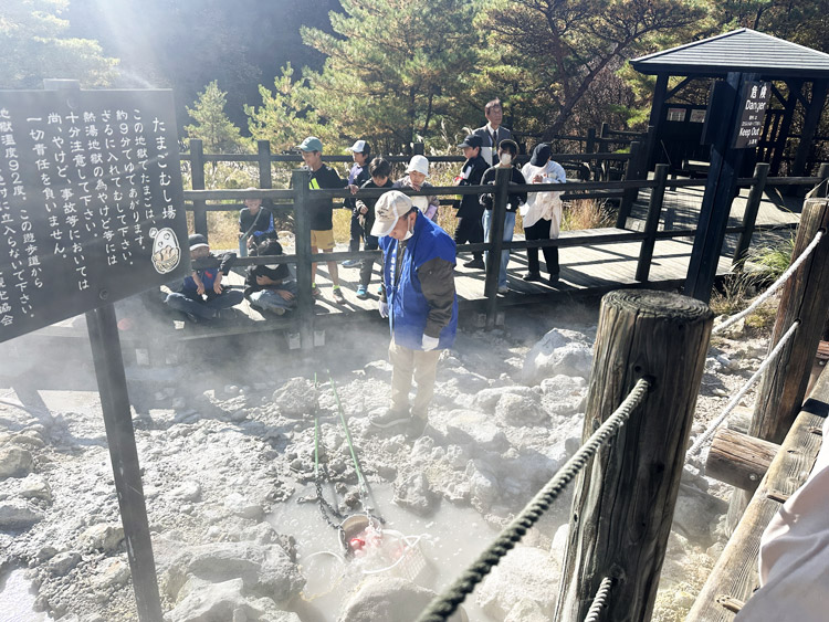 昼食後、小松地獄にて地熱の熱を利用した調理体験を行いました。