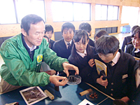 森林(木材)には、温暖化防止のほかにもいろんな働きがあり、また、生物の命の源でもあるということで、自然から借りてきた「オオイタサンショウウオ」「ヤマアカガエル」の卵なども見てもらったけど、結構みんな見たことがあると言うことを聞いて、すごいなと思いました。周りに豊かな自然がたくさん残っていて、登下校の途中でよく見ているんだろうね。こうした体験をいつまでも大切にして下さい。(三ヶ田)