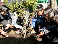 植えたジンチョウゲは1本、6年生は約50人いたので、みんなが少しずつ土を掘って、木を植えた後、また少しずつ土を埋め戻しました。もともとジンチョウゲが植わっていたそうですが、枯れたので、今回の卒業記念としてもう一度、植えることにしたそうです。ジンチョウゲの花はとても良い香りがして、春の訪れを知らせてくれます。本当は、移植したり育てるのが難しい木だけど、後輩の皆さんが大事に育ててくれると思います。花言葉はみんなの友情を表す「永遠」。時々学校に来て、木の生長を見守ってください。(三ヶ田)